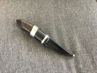 Bildet viser en kniv for Eikerdrakta. Den har blad av rustfritt stål og skaft av myr eik. Holkene på kniven og slire med hengslet oppheng er alt laget av sølv.